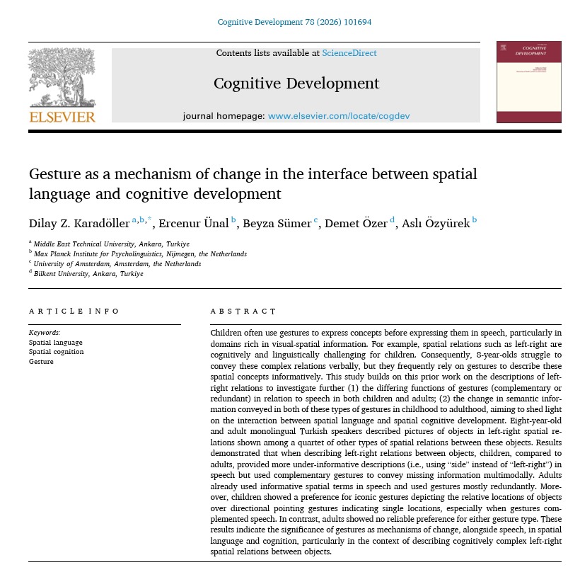 The article titled "Gesture as a mechanism of change in the interface between spatial language and cognitive development" co-authored by our laboratory coordinator, Dr. Dilay Z. Karadöller, has been published in the Cognitive Development!