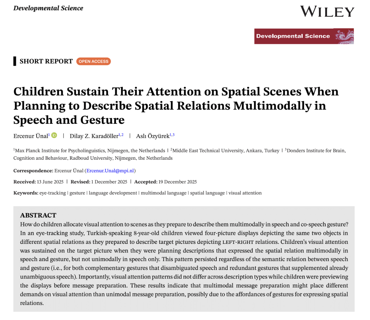 The article titled "Children Sustain Their Attention on Spatial Scenes When Planning to Describe Spatial Relations Multimodally in Speech and Gesture," co-authored by our lab coordinator Dr. Dilay Z. Karadöller, has been published in the journal Developmental Science.